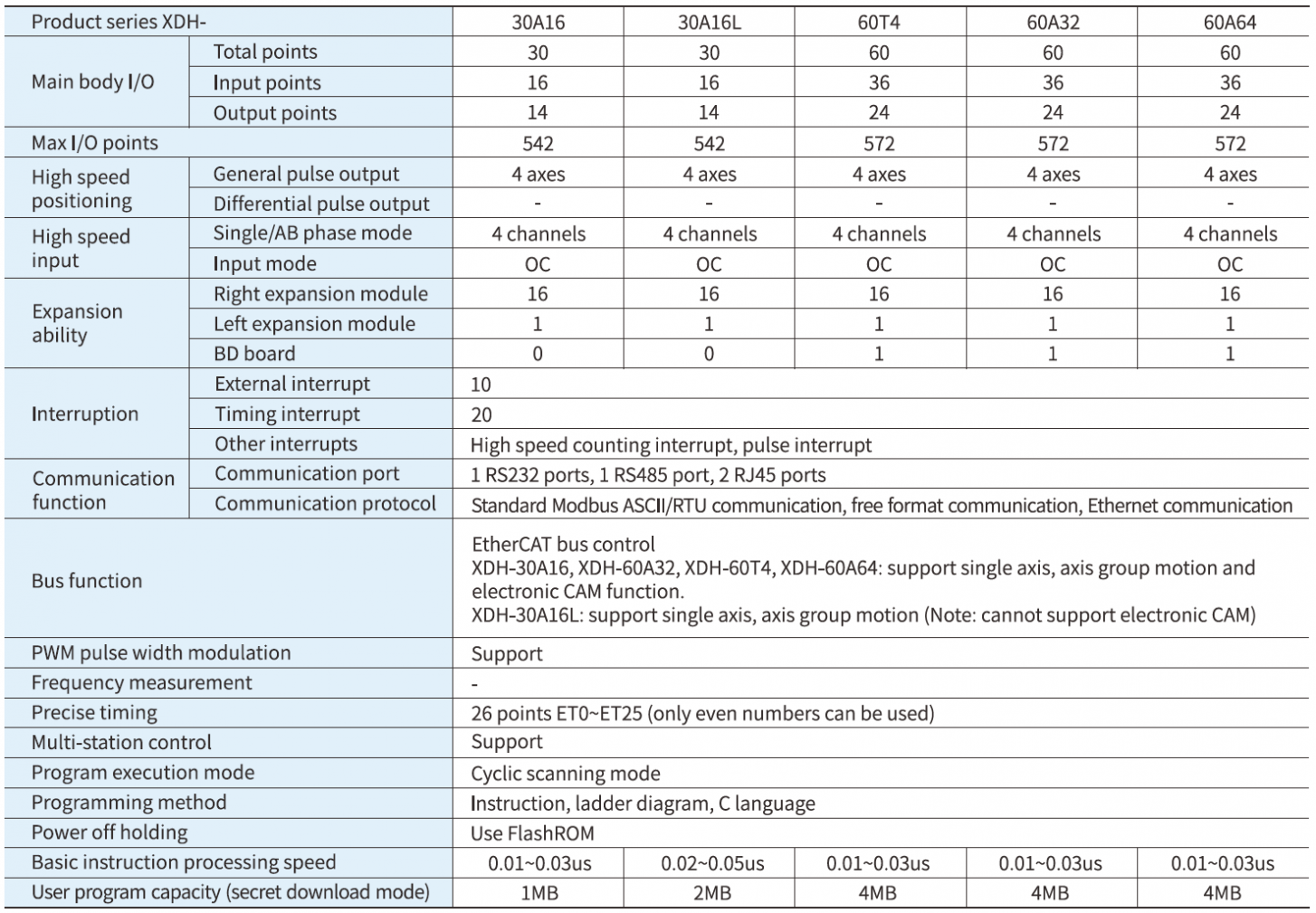 Daha büyük program kapasitesine ve daha hızlı işlem hızına sahiptir, Ethernet iletişimini, EtherCAT veri yolunu, enterpolasyon ve takip gibi hareket kontrol komutlarını, genişletme modülünü ve sol genişletme ED modülünü destekler.