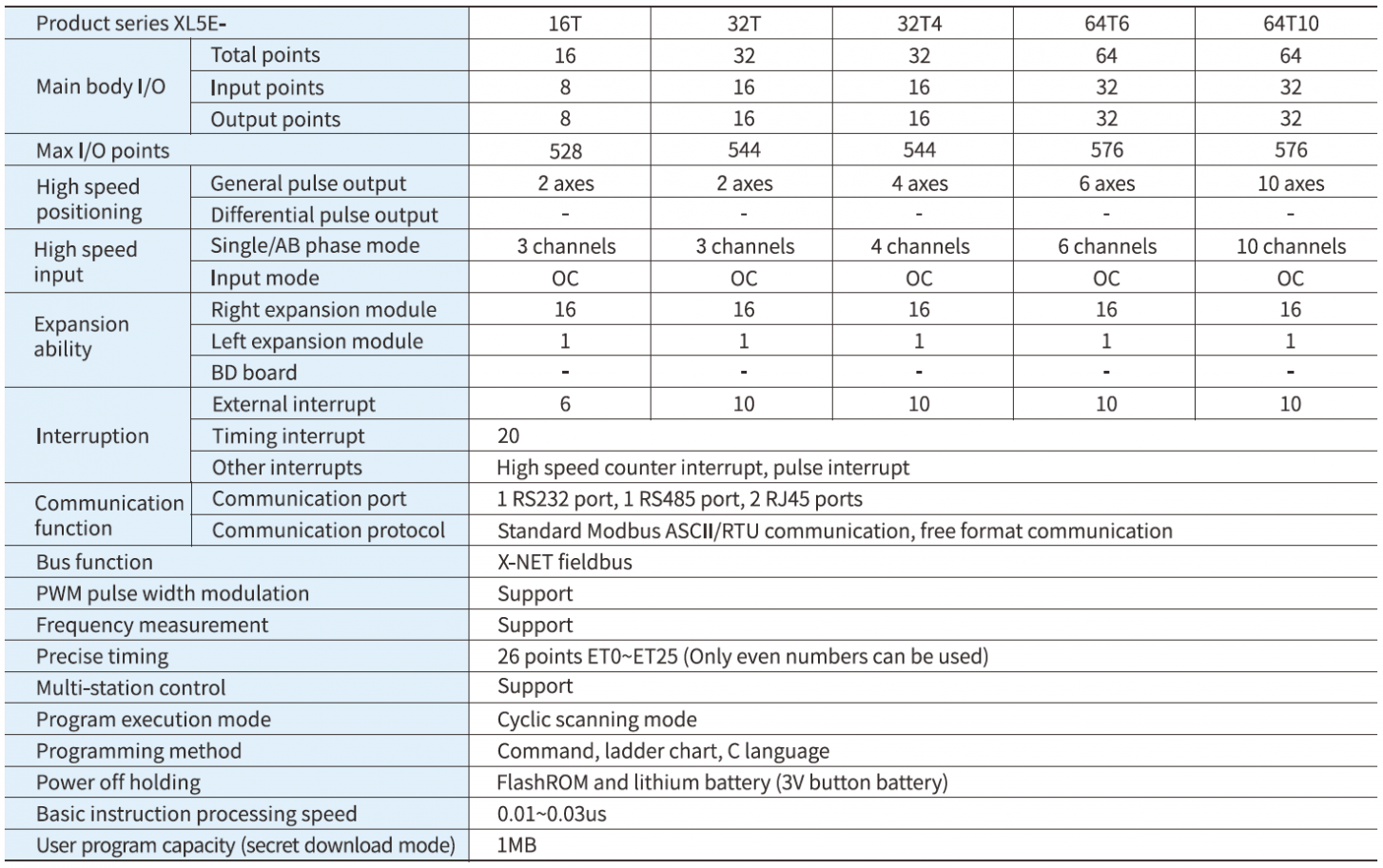 Standart PLC'nin tüm işlevlerine ek olarak, daha hızlı işlem hızına (XC serisinin yaklaşık 15 katı), daha büyük dahili kaynak alanına, 2~4 kanal yüksek hızlı darbe çıkışına, sağ genişletme modülü ve sol genişletme ED modülünün bağlantısını destekler ve çeşitli kullanım gereksinimlerini karşılayabilir.