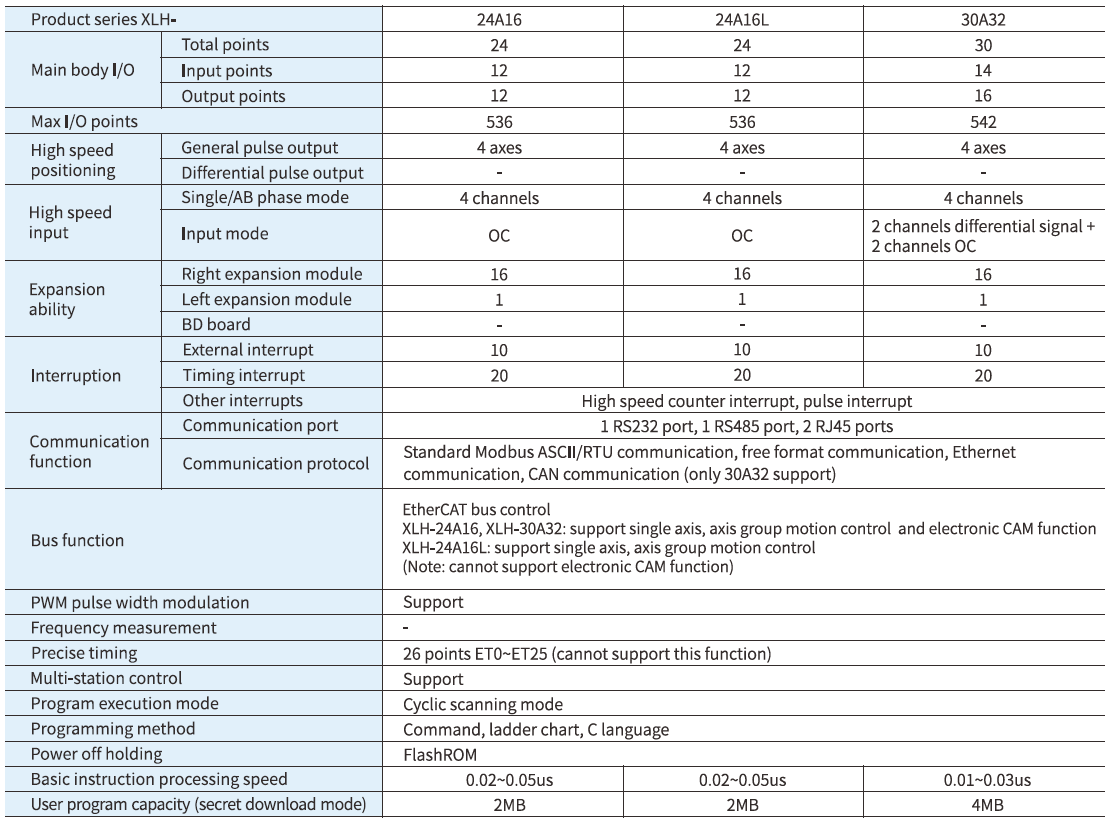 Daha büyük program kapasitesine ve daha hızlı işlem hızına sahiptir, Ethernet iletişimini, EtherCAT veri yolunu, enterpolasyon ve takip gibi hareket kontrol komutlarını destekler, genişletme modülünü ve sol genişletme ED modülünü bağlayabilir.